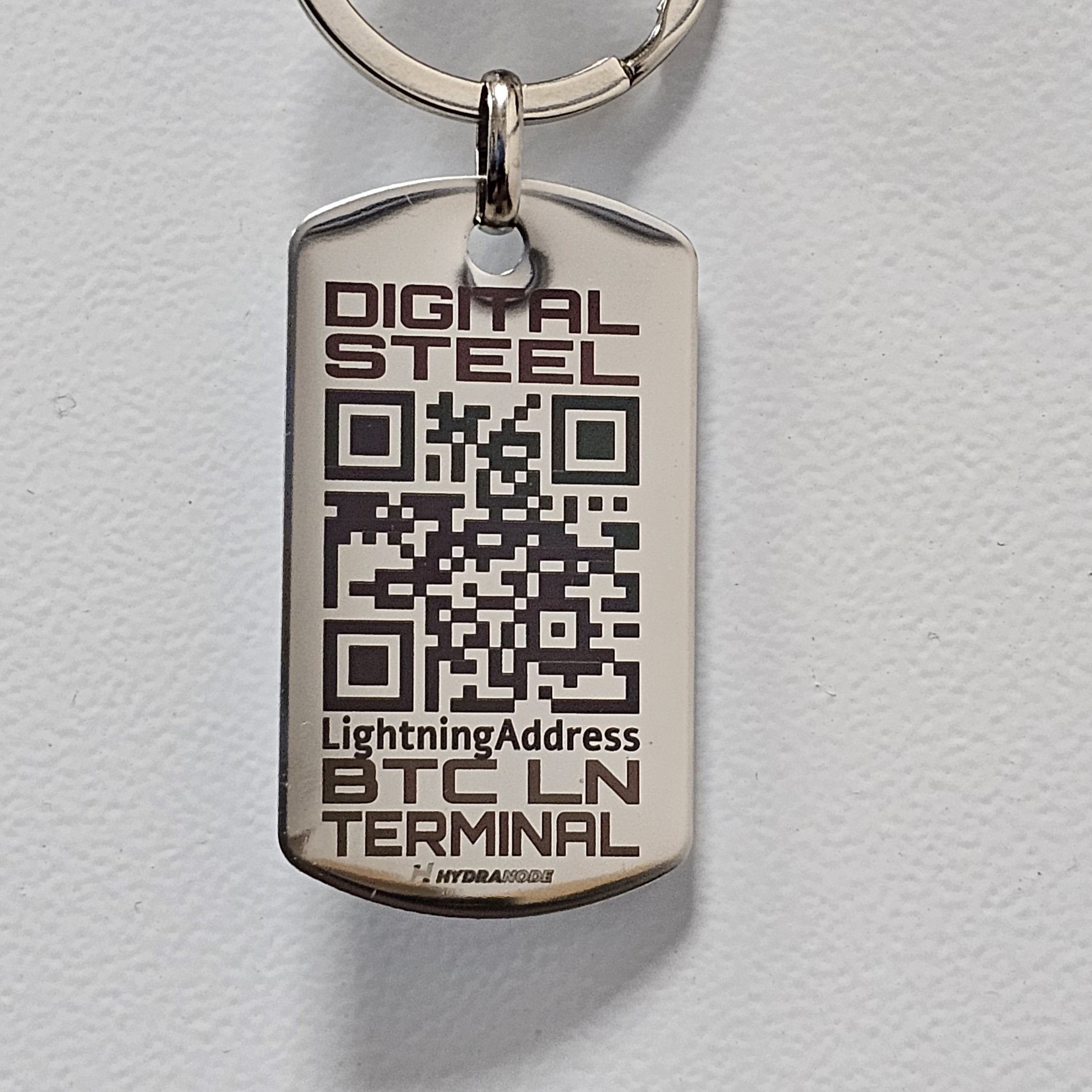 Každý SteelTag je jedinečný. Obsahuje QR kód „Lightning Address“ viazaný na váš HYDRANODE účet. Zosnímaním QR kódu do kompatibilnej LN peňaženky Vám môže zákazník okamžite zaplatiť.